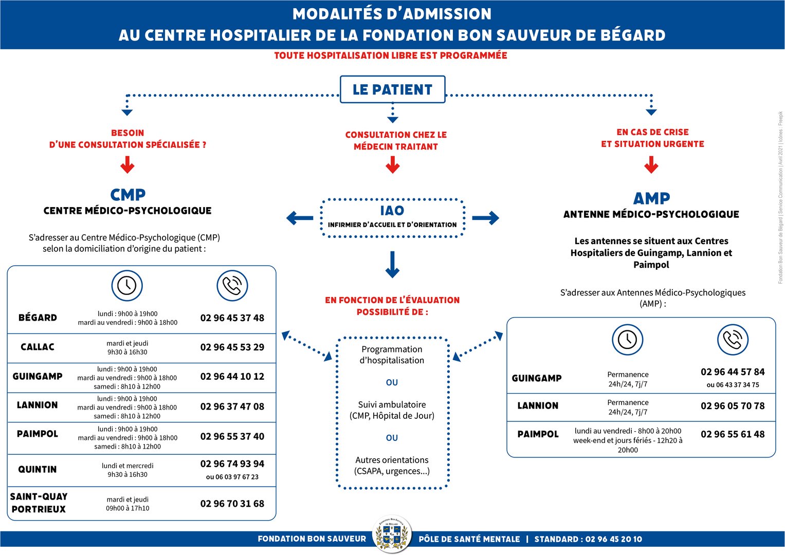 La nuit et les week-ends, le patient peut être accueilli aux urgences de l'hôpital général de sa localité où sa demande sera évaluée par l'infirmier de l'Antenne Médico-Psychologique avant tout transfert au Centre Hospitalier Spécialisé de Bégard.